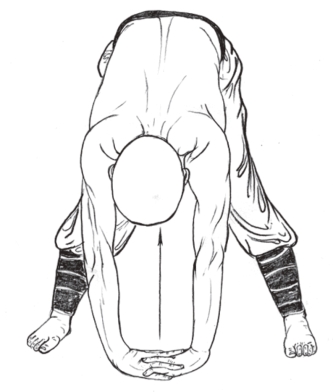 4.上身缓缓前俯,两腿挺直,两手如作揖状至身前地面,两手背触地;目视两手。(图3-102)