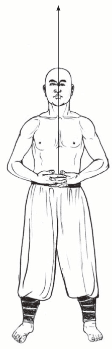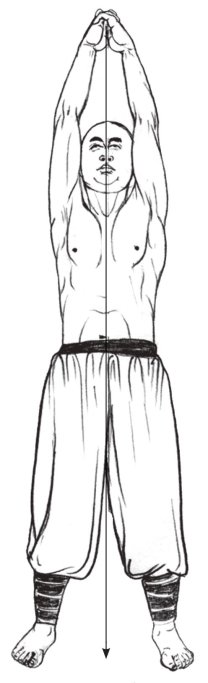 3.两掌向上伸举于头顶上方,掌心相贴;目视前上方。(图3-101)