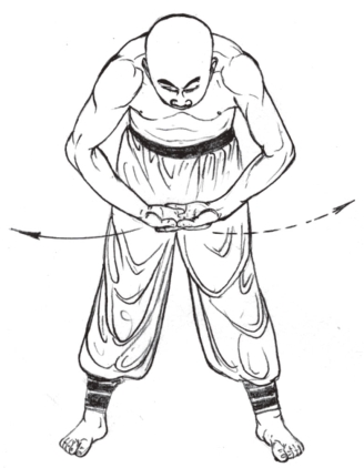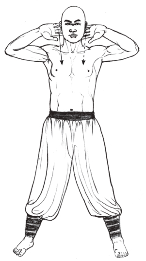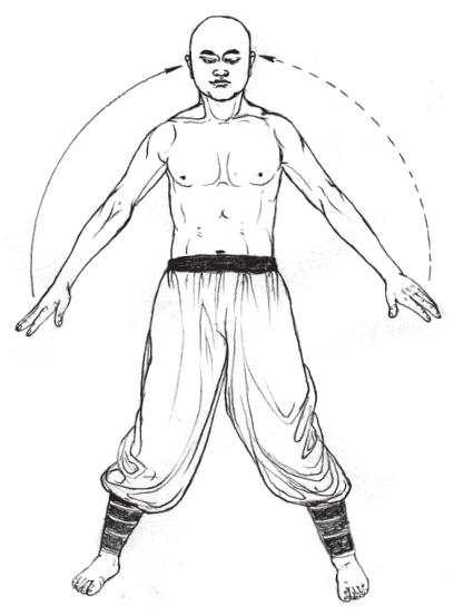 10.正面3次,共吞3口气后,两拳松指成掌,下垂于体侧。(图3-108)