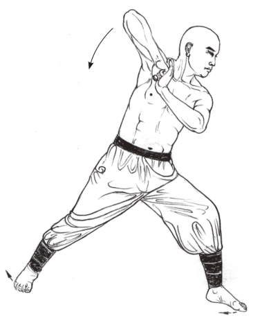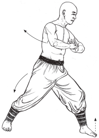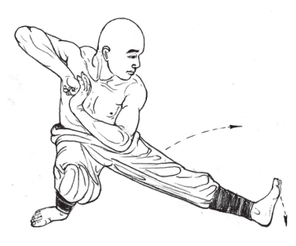 4.接着,起身,右腿蹬伸向左用力,成左弓步,上身向左探;此时,吞气1口;右肘臂随势上抬,目视左前地面。(图3-134)