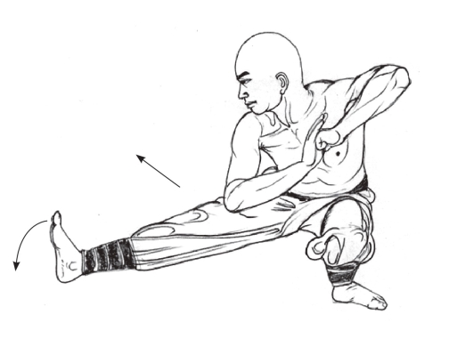 1.右转身做右势列肘势,与左势动作相同,唯方向相反。(图3-135~图3-137)