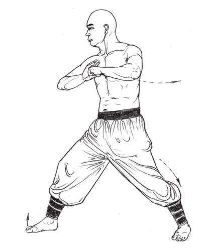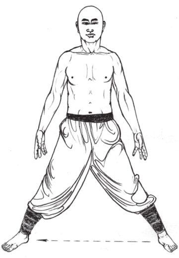 2.左右各做3次,共吞气6口后,上体转正,放下双掌垂于体侧;目视前方。(图3-138)