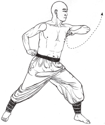 3.两手顺势横拉握拳,左拳平腋,拳眼向内,拳心向下;右拳置于右腰侧,拳眼向里,拳心向下;吞气1口。然后,转头目视左前方。(图3-148)