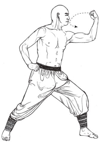 将左拳放开,自下往上一绕,随即握拳向上竖立,拳与额角平齐;吞气1口,目视左腕。(图3-149)