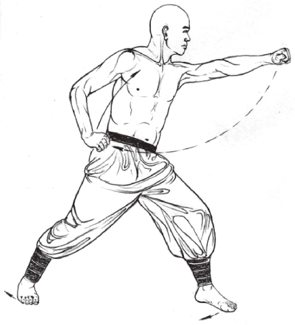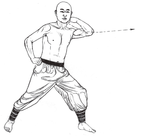 2.左掌绕耳后握拳(握固)向左前伸出,拳背向上;吞气1口。然后,转头目视左侧方。(图3-151)