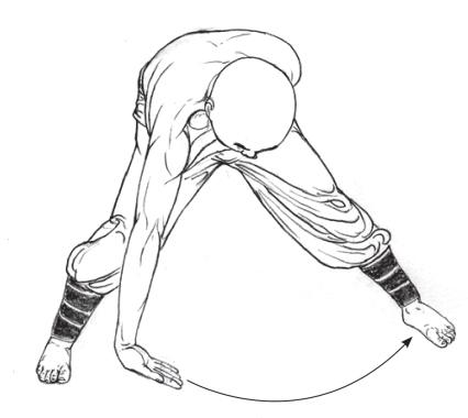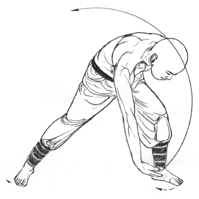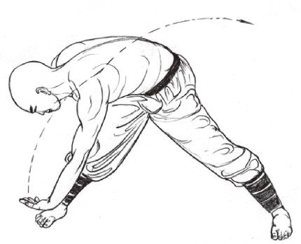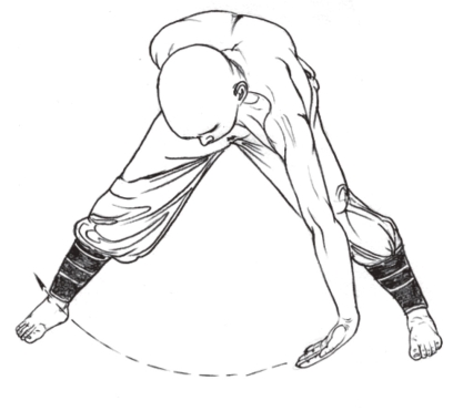 6.头俯腰屈,左掌向左脚下捞至右脚外侧。(图3-164、图3-165)
