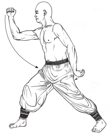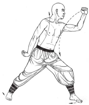 7.腰身随起,左手经右侧向左侧上做屈肘竖臂握拳的望月状,拳眼与面相对;目视拳眼;然后,吞气1口。(图3-166)