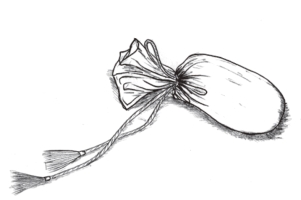 用厚帆布缝制一个圆柱形布袋,长约60厘米,粗(圆柱周长)约13厘米,一端缝牢固,装入五谷(稻子、小麦、玉米、绿豆、大豆),在另一端留6~7厘米空余处用绳扎紧,余尾处作为手执之柄。重约1千克。(图3-175)