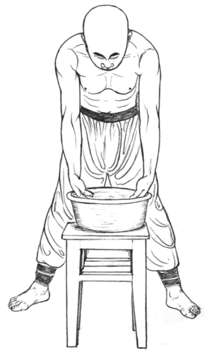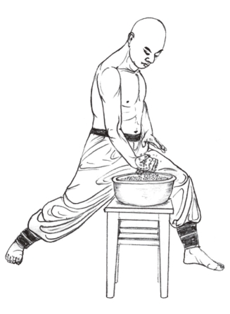 取二豆能解火气,又取磨砺坚其皮肤。如此百日,兼置小圆石子插之,至于久久,则从前所积之气通行至手,其皮肉筋膜相得合一,而无丝毫之浮游。不用时与常人无异,用时意之所至坚于铁石,并掌可破牛腹,侧掌可断牛颈,挝拳可碎虎脑。