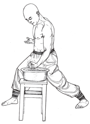 4.再将黑豆与绿豆各十斤拌匀,装于盆中。用抓、插、握等法进行练手,不计次数,直至两手疲乏而歇息。(图4-6、图4-7)