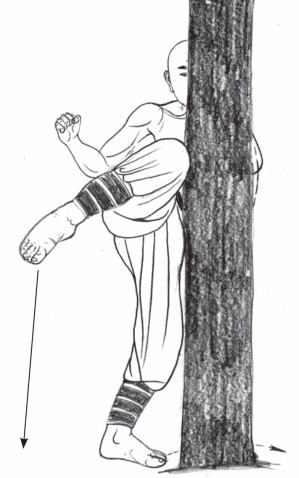 5.左脚向后退步,面对树身之际,右膝提起,横击树干。(图4-37)