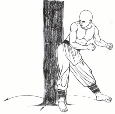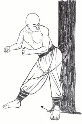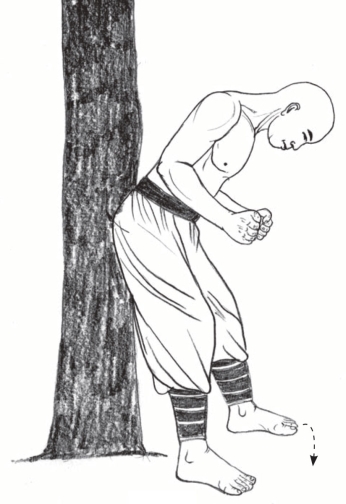3.左脚移动一小步,臀部一收,略有转身,右臀部撞击树干。(图4-35)