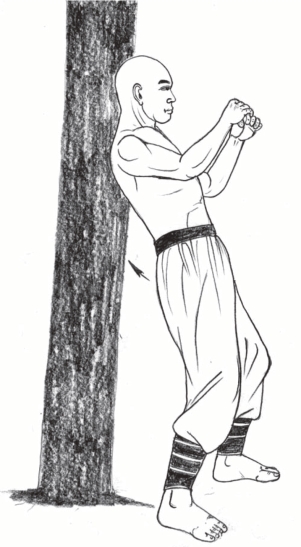 2.以背部撞树的反弹力向前正身,臀部向后撅,撞击树干。(图4-34)