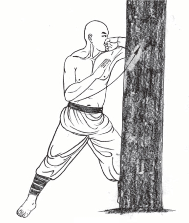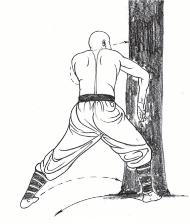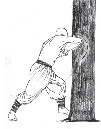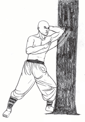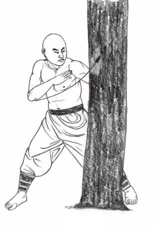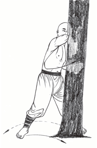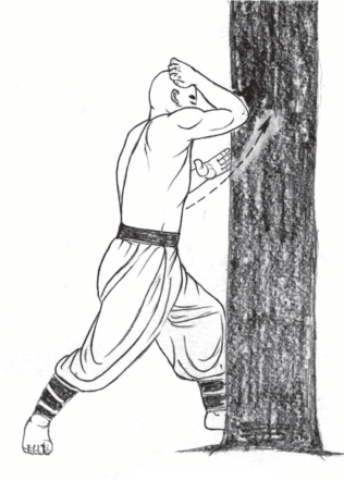3.双脚换跳步成右弓步,右前臂、肘部、手背用旋裹劲靠击树干。(图4-40)
