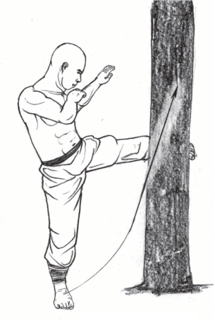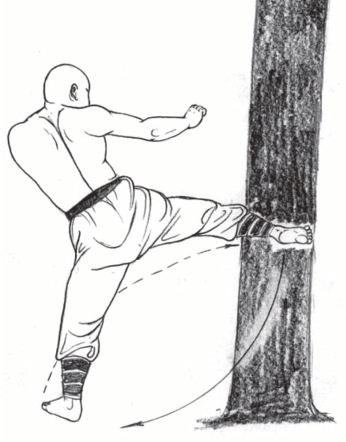 1.上体向左旋转,右腿鞭踢向树干,右脚高与裆平。(图4-48)