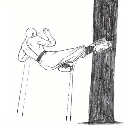 3.左脚尚未落地时,上体向左旋,右脚弹地而起,鞭踢树干上段,整个身体悬空。(图4-50)