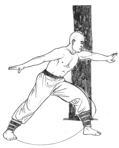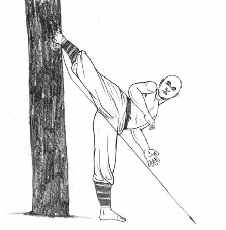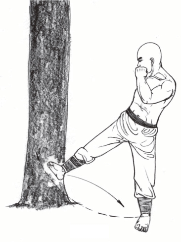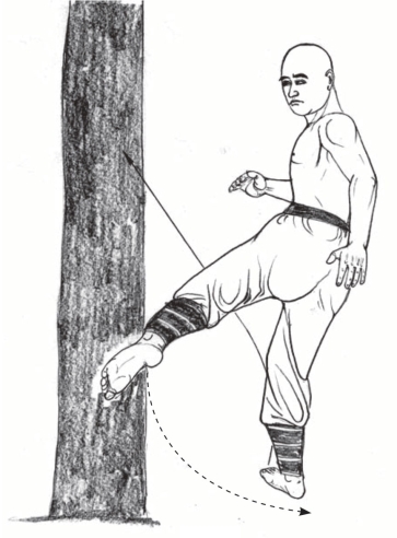 2.左转体,提起右脚随转体向树干铲踢,高与左胫平。(图4-58)