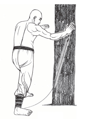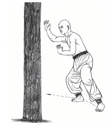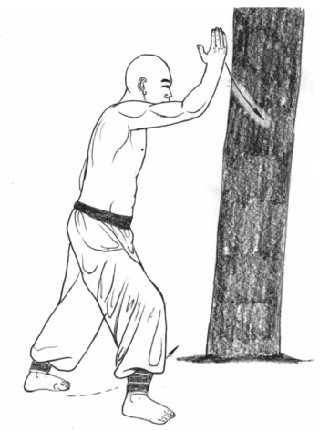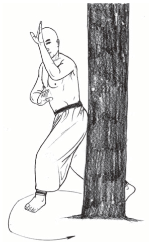 左脚收于右脚内侧,右脚迅疾向右侧摆步,面对树干,两脚绕步而行。围着树干行走近一圈时,左脚向树干跨进一步,右掌拍击树干,高与颔平。(图4-64~图4-67)