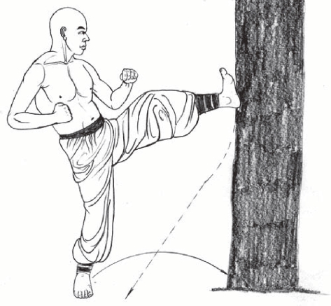 1.右掌一收,右鞭腿迅疾踢向树干,高与腹平。(图4-68)