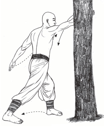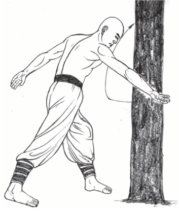 1.收左脚,立起上身成左弓步,右手前臂内裹,用外侧打击树干。(图4-72)