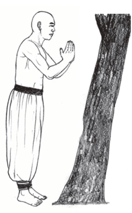 3.左脚退于右脚内侧,并步正身直立;两掌合十于胸前;呼吸自然,目视树干。(图4-74)