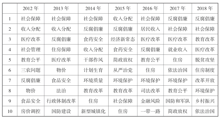根据人民网“全国两会热点调查”结果,整理了2012—2018年全国两会期间民众最关心的问题(如下表)。