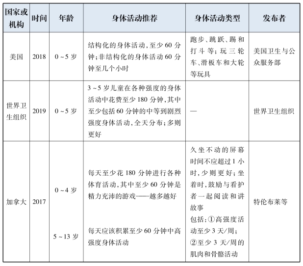 表1-3 各国和各机构儿童身体活动指南