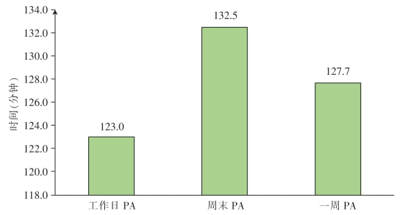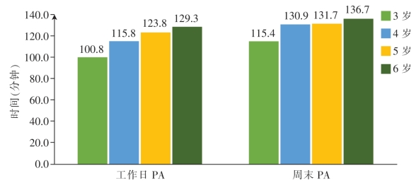 我们把工作日与周末PA时间分开来看,工作日和周末的平均活动时间分别为123分钟和132.5分钟,达到推荐量的人群占比分别为3.7%、9.5%。幼儿周末的活动时间显著高于工作日,说明幼儿在周末期间PA时间是有明显提高的。通过分析不同年龄幼儿身体活动特征发现(如图1-5),随着年龄的增长,幼儿每天PA时间是逐步增多的,而随着年龄的增加而周末的时间增长幅度是减少的,说明幼儿随着年龄在周末身体活动时间逐渐增加的优势在进一步缩小。
