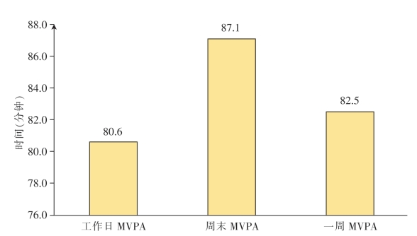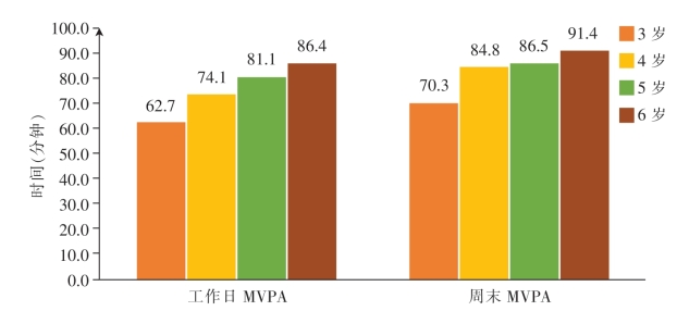 与身体活动时间(PA)总体达标率相比,江西省学龄前儿童在中高强度身体活动(MVPA)方面却表现良好(如图1-6),平均MVPA时间达到82.7分钟,工作日的平均时长为80.6分钟,周末的活动时长为87.1分钟,明显要高于《学龄前儿童(3~6岁)运动指南》中每天MVPA推荐的60分钟以上的时间,平均每天MVPA活动时间达标率为88.2%。