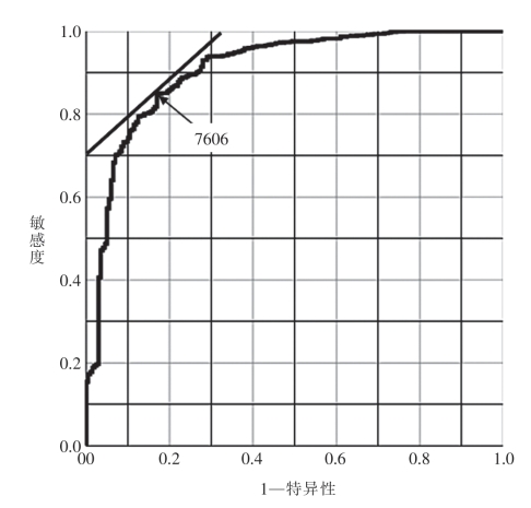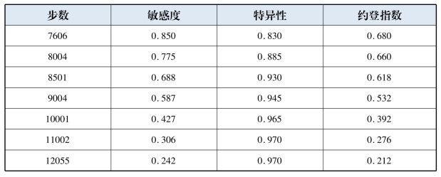 幼儿步数与MVPA 60的ROC,结果如图1-12所示。ROC曲线下面积(Area Under the Cure,AUC)为0.907,符合AUC>0.7的要求,说明实验的准确性较高,通过ROC确定切点有较好的价值。图中已标出约登指数最高的点,具有良好特异性的指标如表1-4所示。