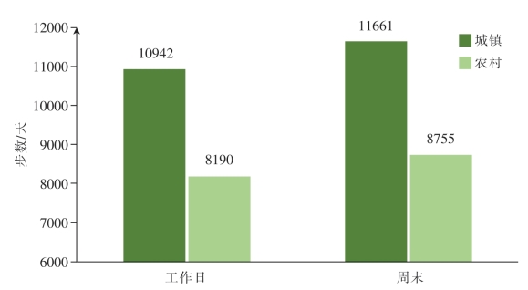 通过分析,江西省学龄儿童平均每天步数10388步,其中工作日10259步,周末10875步,总体来看差距不是太大。从年龄角度来看(如图1-10),除了3岁幼儿平均步数在8000步左右,其他年龄段均在每天1万左右,差距不大。但是在城乡之间,不同群体幼儿的步数存在明显差距,城市学龄前儿童平均每天步数为11611步,乡村平均为8755步,即城市幼儿步数高于乡村(如图1-11)。