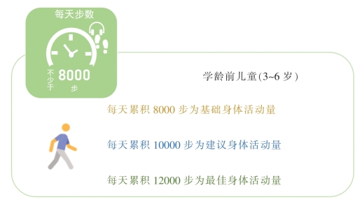 有研究指出,可以将学龄前儿童身体活动推荐量转化为步数推荐量作为他们进行身体活动的指导方案,一个基于加速度计客观测量、能反映身体活动水平的简单实用指标——步数/天,得到研究者、实践者和普通大众的一致认可。步数推荐量的研发与推广也更有助于将身体活动指南转变为大众容易理解的形式。依托严谨的科学研究方案,制定每日步行量目标,以期达到身体活动指南中的中、高强度活动推荐量。同时,相较于多样的活动方式,步行贯穿于人们日常生活中,已经被公认为是最好的身体活动,首先,步行是人类最古老和最基本的身体活动方式;其次,生活中所有事物的进行都离不开步行;最后,生活中步行是最方便进行的身体活动。