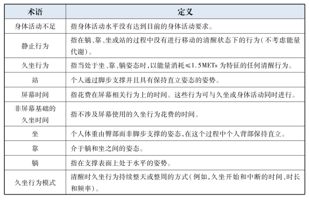 久坐行为(又称静坐行为),是指清醒状态下坐姿、斜靠或卧姿时任何能量消耗≤1.5METs的行为。常见的久坐行为包括坐姿、斜靠或卧姿时的“屏幕时间”活动(如看电视、玩智能手机、平板电脑等);阅读、画画、做功课;学校里的坐姿,乘坐交通工具时的坐姿等。MVPA是指各种能使心跳加速并在一段时间里气喘的运动,包括在体育课、体育锻炼、体育训练以及日常生活中(如跑步、舞蹈、游泳、打闹、玩球、骑自行车等)进行的各种身体活动。PA是指任何骨骼肌收缩引起的高于基础代谢水平能量消耗的身体活动,如跑、跳、翻滚,做有肢体运动的游戏。