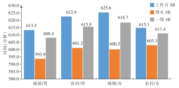 城乡之间不同性别幼儿久坐行为时间分布如图2-4所示,在男童久坐行为中,城市幼儿要低于乡村幼儿;女童在久坐行为方面,城市女童久坐行为时间反而高于乡村女童。说明江西省学龄前儿童城市男童更活跃,女童更“平静”,侧面反映城乡差异对女童身体活动结构有重要影响。这一点对后期发展与改善城市学龄前女童群体体质健康指明了方向,以补齐江西省学龄前儿童身体活动水平的短板。