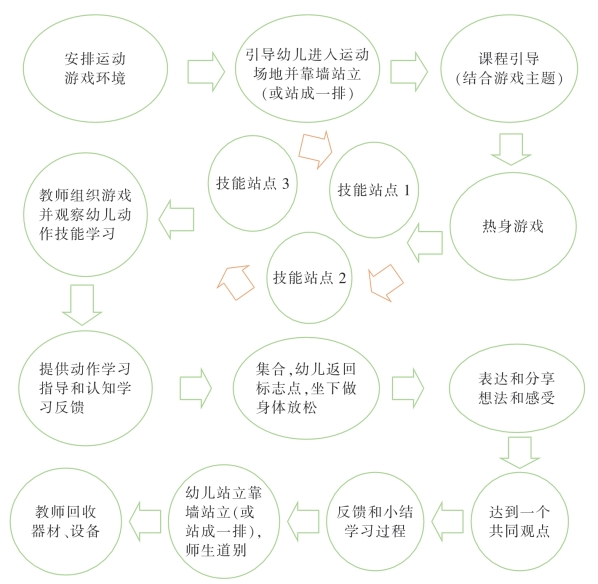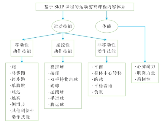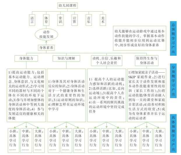 合理的课程设计本质上是优化发展时序,即适宜性选取和课程内容元素序列化编排。依据我国《3~6岁儿童发展指南》中强调学龄前儿童动作发展,又因我国义务教育强调体育课堂“运动技能”和“体能”的学习,为保证教育活动编排的系统性和整体性,幼儿园体育课程应保持相应的链接——“幼小衔接”。可优先选取移动性动作技能、非移动性动作技能、操控性动作技能、体能作为课程整体的内容,保证技术动作的连贯性和自然发展规律,并注意小学化课程的安排(如图3-12)。