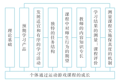 在满足运动发展规律的前提下,如何进行具体课程的安排呢?梅茨勒(Metzler)对此已有研究,并提出教学模型(图3-10)。该模型不仅囊括了传统泰勒课程模式中包含学习成果预测、合理的课程设计、师生的互动值和课程成果评价四个内容,即“目标—内容—实施—评价”四个内容,而且还纳入了“独立任务”“教师专长”以及“保真度测量”元素。该模型从“预期学习产品”到“测量课程实施保真度的机制”七个部分构成了课程设计逻辑语言,更为创新、全面、具体。
