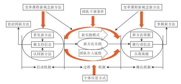 综上所述,教师变化是指教师内隐信念和外显行为的变化。促进教师改变外部条件包括改变课程特征和改变组织单位学校的干预。