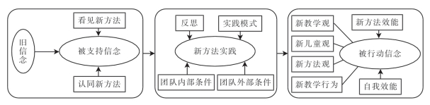 幼儿园教师变革包括启动机制、过程机制和确认机制。启动机制包括两个条件:现场看到新方法和心理认同新方法。其本质是教师意识到新的方法或支持信念的建立,这是教师改变的内在机制。这一过程包括三个外部条件:新方法实践模式、原创课团队干预过程、幼儿园团队干预因素和教师个体反思的一个内部条件。新方法实践模式是指在不同层次上从模仿班提升到原创课团队实践模式。原创课团队因其最深刻的自我反思情节而具有独特的价值。原创课团队团队干预过程分为三个阶段:第一阶段由“自己—领导—核心”三级提升,第二阶段由“自己—领导”两级提升,第三阶段由“自己—全体成员”两级提升。幼儿园团队干预因素分为内部因素和外部因素,内部因素分为领导者特质和研究共同体特质,外部因素分为高标准公开课平台和专业权威引导。教师的反思方式是过程机制中唯一的内在条件,其他三个外在条件都通过个体反思的中介作用影响个体的内隐信念和外显行为变化。因此,反思是联系外部条件和教师变化的中介变量,在教师变化中起着不可或缺的作用。能做出根本性改变的教师不仅是有意识的自我介绍者,也是有意识的他人介绍者,他们对他人的教学行为有同理心。确认机制包括两个条件:新方法效率和自我效率。新方法效率是将教学效率归因于新方法的外在因素。自我效能感是内在的归因。教师相信自己有能力在任何情况下将新的理念和方法贯彻到教学行为中。自我效能感的本质是掌握新的方法,建立被行动的信念。综上所述,教师的转变经历了一个艰难而漫长的过程,即建立支持信念,然后进入新的方法实践,最后建立行动信念。