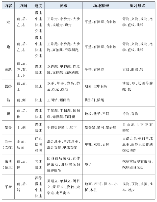 基础运动技能练习被广泛认为是参与一系列体育和娱乐活动所需的较为复杂的、专门性的技能基础,基础运动技能包括物体控制(例如,投掷、捕捉)、运动(例如,跳跃)和稳定性(例如,转动、弯曲)技能(如表3-4),这些技能通常是在儿童时期发展起来的。早期的研究表明,除了支持身体和运动发育,基础运动技能也是增强幼儿参与体育活动的重要因素。并且该研究证实小学年龄的身体活动量和学龄前儿童基本运动技能有着密切的相关。最近的研究还表明,在基础运动技能练习中,身体活动的强度会增加,尤其是在涉及运动技能时。
