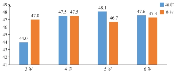 江西省学龄前儿童的睡眠障碍测试得分均低于量表的临界值54分(低于为健康)。城市3~6岁儿童的睡眠障碍的得分表现在3岁这个年龄段,平均分为44分,4~6岁平均得分在47.5左右。乡村儿童,3~6岁的睡眠障碍平均得分维持在47分左右。从总体的平均成绩来看,江西省学龄前儿童的睡眠都处在健康的范围内,其原因我们猜想是在“家长积极的干预”“白天学业”“身体活动量大”“该年龄段儿童自身成长”等因素共同作用下造成的,这个猜想还需要后期继续跟踪调查才能确认。