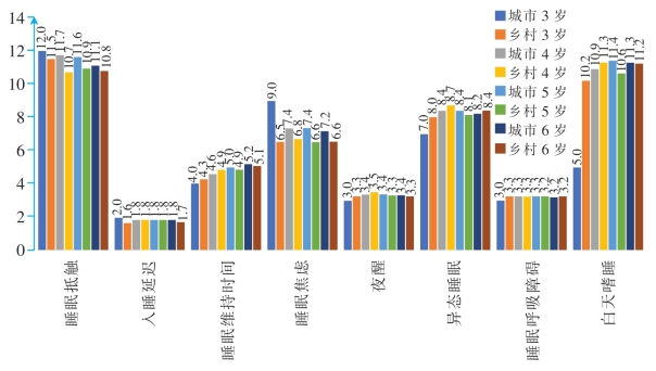 本次测试对江西省学龄前期的各个年龄段的儿童所发生的睡眠障碍的类型进行调研分析,这8种类型分别为睡眠抵触、入睡延迟、睡眠维持时间、睡眠焦虑、夜醒、异态睡眠、睡眠呼吸障碍以及白天嗜睡。由图中的数值跟量表的标准比对分析发现,睡眠抵触超出了量表的临界值,这说明睡眠抵触现象在3~6岁的儿童中是非常普遍的现象,而其他维度不论是城市儿童还是乡村儿童,其睡眠障碍指数处在临界线附近,从线性关系来看随着年龄的增长,虽然增长率缓慢,但睡眠障碍的发生程度依然呈增长趋势。结合图5-8,对比城乡各个年龄段的睡眠障碍现状,同年龄层各维度的表现普遍是乡村儿童优于城市儿童。此外,3岁城市儿童的睡眠焦虑已成常态,远远超过临界值。换句话说就是,城市的学龄前儿童的睡眠障碍的发生程度高于乡村学龄前儿童。为进一步验证,对江西省城乡间的儿童测试数据进行统计学分析,我们发现,在睡眠抵触、睡眠焦虑两个维度上,江西省城市儿童与乡村儿童存在明显差异性,乡村儿童睡眠抵触、睡眠焦虑的表现要优于城市儿童。