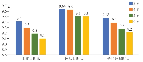 图5-11为江西省3~6岁儿童的平均睡眠时间,其中3周岁的孩子平均睡眠时间为9.48小时,4周岁9.39小时,5周岁9.28小时,6周岁9.22小时。就各年龄段平均睡眠时长来看,都集中在9.30小时,但是均没有达到推荐的标准时长。分开来看,这四个年龄段在工作日的睡眠时长呈现明显下降趋势,其中6周岁的睡眠时间仅9.10小时。到了休息日,睡眠时间有了增长,但是均没有达到10个小时。