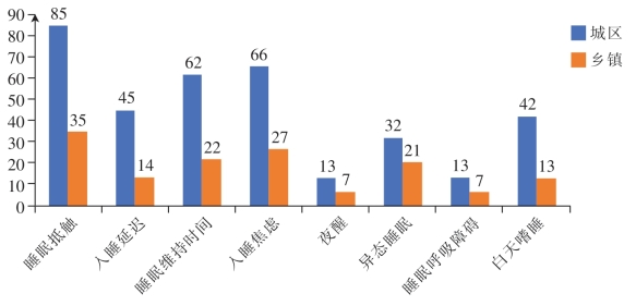 为了进一步了解睡眠障碍儿童的睡眠障碍类型,我们进一步对已确诊的126名睡眠障碍儿童进行统计学分析,如图5-12,我们将儿童按照城乡分组,可以看出,江西省城区儿童的人数明显高于乡村。在城区,睡眠抵抗、睡眠焦虑的人数明显偏高,是睡眠障碍最容易发生的障碍类型。
