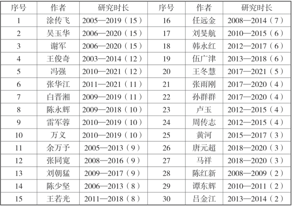 1.从作者研究时长分析。我国民俗体育研究学者研究时长总体较长,排在前三名的研究作者分别为涂传飞、吴玉华、谢军,研究时长均为15年,紧随其后的作者分别是王俊奇、冯强、张华江、白晋湘,研究时长分别为12年、11年。通过统计发现,其中研究时长≥10年的作者有10位,占30位高产作者研究时长总数的1/3。这说明从研究时长角度来看,我国民俗体育研究领域研究时长的代表性人物主要是以涂传飞、吴玉华、谢军等十人组成的资深学者。