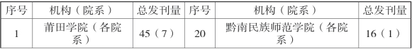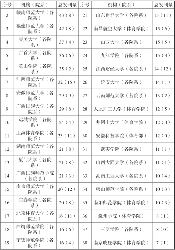 机构发文量体现着该机构在此研究领域的研究力度的深浅,同时也可展现该研究机构所在的学者的研究水平。通过发掘各机构中文学术期刊和核心期刊发文量,一方面,能够体现出该机构在此阶段对该学科领域所做出的贡献;另一方面,通过该机构的核心期刊发文量定义该机构在此研究领域的研究成果及研究水平和深度。鉴于此,本书引用中国知网(CNKI)中文学术期刊论文1958篇,通过筛选最终确定1953篇论文为研究样本,通过Citespace5.7.R2可视化软件对我国民俗体育研究领域机构发文量及机构核心期刊发文量进行数据分析,并对所得数据进行统计,最终选取前38所高产机构为研究对象进行分析描述。通过数据分析后,发现所得数据部分出自同一所机构的不同院系或者是同一所院校的改名等。例如:上海体育学院与上海体育学院研究生院都有对民俗体育的发文;赣南师范大学原名赣南师范学院也都曾有过对我国民俗体育研究领域的发文等。鉴于此,经过统计分析与结合,并以各机构的校名为主体,各院系为组成单位,绘制出机构总发刊量与核心期刊发刊量表格,如表5-1、表5-2所示。经统计共有413所机构对我国民俗体育相关领域进行了研究和探索。首先,对研究机构总发文量进行分析,由表5-1可知,有关我国民俗体育研究的机构期刊发文量位居第一的是莆田学院,发文量为45篇;其次是赣南师范大学,仅次于莆田学院,发文量为43篇;再次是福建师范大学,发文量为42篇,发文量前三位的机构发文量比较相近,并且在发文数量上具有绝对的优势。值得注意的是,莆田学院是福建省妈祖民俗体育文化研究基地,是闽台唯一一所妈祖民俗体育文化研究单位。妈祖文化是维系海峡两岸民主一家亲的精神纽带,因此,推动福建省闽台妈祖文化的构建,海外妈祖体育文化人才的培养,以及科研工作的展开等,有助于推动两岸关系的友好往来,同时代表着中华文化的传承。对机构发文数据进一步研究发现,其中机构发文量≥20篇的机构共有16所,占发文机构总数的3.9%;10篇≤机构发文量<20篇的机构共有19所,占发文机构总数的4.6%;5篇≤机构发文量<10篇的机构共有31所,占发文机构总数的7.5%。通过对发文机构单位、机构总发文量、机构核心期刊发文量、作者信息查阅等基本信息概述,笔者将所得数据进行统计研究,可知以下几点特征: