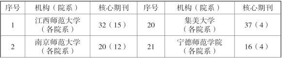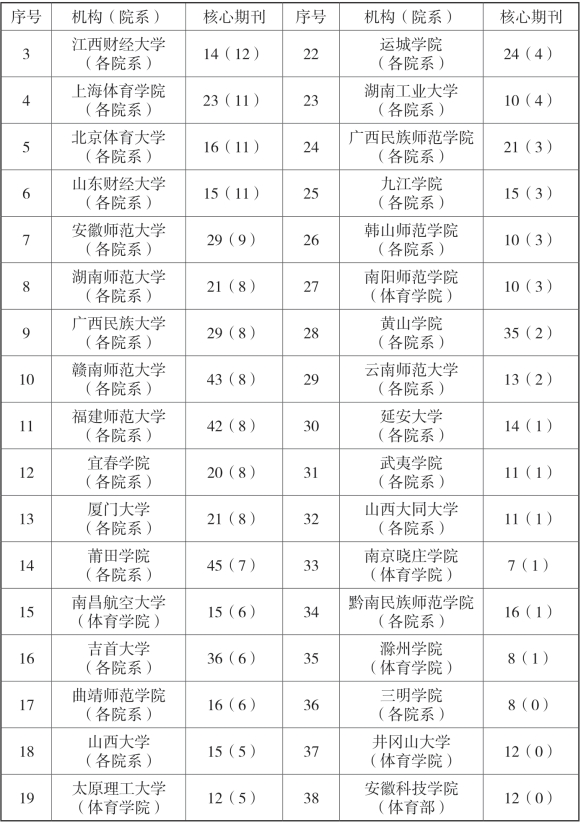 2.从核心机构发文分析。由表5-2可知,江西师范大学核心期刊发文量排名第一,共发文15篇,并在总发文量机构中排名第七;此外南京师范大学、江西财经大学、上海体育学院、北京体育大学、山东财经大学的核心期刊发文量均超过10篇。通过数据对比发现,我国民俗体育研究发文机构中核心期刊发文总量与期刊发文总量相差甚远。例如,莆田学院各院系期刊发文总量最高,但核心期刊发文量却寥寥无几,集美大学、黄山学院等也出现此类现象。部分高产机构甚至没有核心期刊发文量。例如,安徽科技学院、井冈山大学等。由此可见,我国民俗体育研究领域核心期刊发文量与总期刊发文量比例相差过大,仅有北京体育大学、上海体育学院这种科研水平较高的体育院校机构和南京师范大学、江西财经大学、江西师范大学等师范类机构发表我国民俗体育研究领域具有代表性意义的文章,这也凸显了我国民俗体育核心研究团队少、规模小、研究较为散乱的问题。值得注意的是,在核心发文量≥5篇的机构中,仅有广西民族大学总发文量为29篇,排名第九位,其中核心期刊8篇,同样位于第九位。这是因为广西民族大学原名中央民族学院(今为中央民族大学)广西分院,广西民族大学因其历史原因,在民俗体育研究方面得到大力发展。此外,我国本科阶段没有民俗学,民俗学专业属于社会学二级学科,只有博士阶段才能对这个专业进行招生。所以民族类高校的民俗体育发展并不理想。像北京体育大学、上海体育学院、江西财经大学、福建师范大学等高校之所以在民俗体育核心期刊层面发文较多,主要是因为这些高校均形成了硕—博培养体系。此类学科的开展对推动民俗体育的发展起到了重要作用。