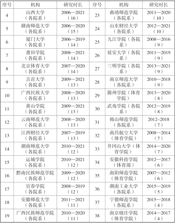3.从机构研究成果分析。在高产机构中,影响年限较长的有江西师范大学(各院系)、福建师范大学(各院系)、集美大学(各院系)、北京体育大学(各院系)、山西大学(各院系)等几十所研究机构,其机构发文量、研究时长和研究年限范围呈阶梯式上升趋势并与其研究成果成正比。值得注意的是,在研究成果较多的几所机构中,如南京师范大学(各院系)研究年限为2010—2018年,其发文量较高,达20篇,在机构期刊发文总量中排名第15位,其中包括核心期刊12篇,但是其研究年限仅为9年;南昌航空大学(体育学院)研究年限为2008—2014年,发文量为15篇,研究年限仅为7年。此外,从这些影响时间较长的机构的发文量来看,部分机构发文量较低。例如,山西大学(各院系)研究年限范围为2006—2021年,研究年限为16年,总发文量为15篇,其中包括核心期刊5篇,相对其他高产机构而言,山西大学产量较低,且具有含金量的期刊论文占比较少。由此可见,在我国民俗体育研究领域中,存在着资深的具有影响力的领军机构,能够较长时间地从事民俗体育相关研究,并形成了稳定的研究方向,有丰富的科研成果;同时在部分机构也存在着影响时间较长,但是总发文量较低且核心期刊文章占比较少的现象;在部分发文量较高的机构中,核心期刊论文占比较高,具有较高的学术影响力,但是研究年限却不长。