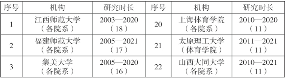 表5-3 民俗体育研究领域高产机构研究时长与研究年限