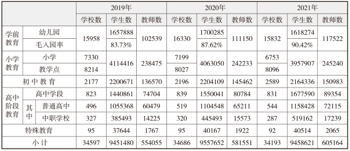 表1-1-1:江西省基础教育2019—2021年发展情况相关数据对照表