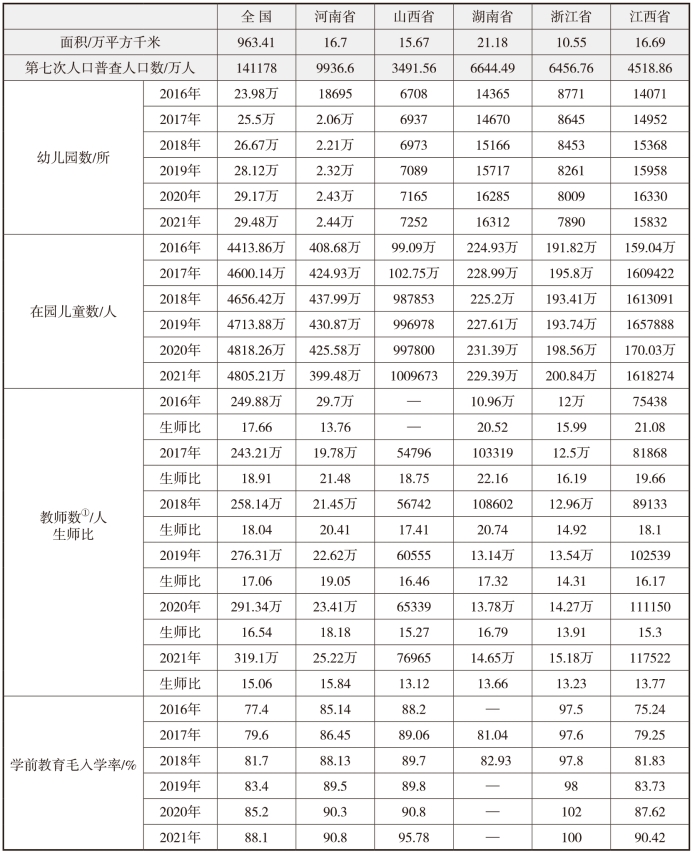 表2-1-2:全国及相关省份近六年学前教育发展情况对照表